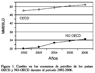 En la Tabla I se muestran los consumos de petróleo de las distintas regiones del mundo, desde el 2002 hasta el 2005 y se hace la proyección del consumo para el 2006 (AIE, 2005, 2006). La Agencia Internacional de Energía clasifica los distintos países del mundo en (OECD, 2005) pertenecientes a la OECD (Organization for Economic Cooperation and Development) y no pertenecientes a la OECD o No-OECD. De acuerdo con los datos de la Tabla I, el consumo petrolero del mundo pasó de 78,0 a 83,9MMBBLD (millones de barriles día) y se proyecta para el 2006 como de 85,4MMBBLD. El consumo de los países OECD es mayor que el correspondiente a los No-OECD; sin embargo el crecimiento anual en consumo de petróleo de los países No-OECD es ligeramente mayor que aquel de los OECD (0,70 vs 1,15MMBBLD/año; ver Figura 1). Un aspecto a resaltar es que el incremento del consumo total de petróleo que se espera entre el 2002 y el 2006 es de 7,4MMBBLD. Esta cantidad es de la misma magnitud que la producción promedio de petróleo de Arabia Saudita en el 2002 (World Oil, 2004).