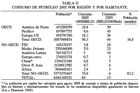 En la Tabla II se muestra el consumo de petróleo en el 2005 por regiones (AIE, 2005) y se incluye la población de las mismas. Se puede observar que los patrones de consumo promedio de energía por habitante son muy diferentes entre los países pertenecientes o no a la OECD. Llama la atención que China y otros países de Asia, con el 52% de la población mundial, tengan consumos de energía por habitante por debajo del promedio de los países No-OECD. Es lógico esperar una tendencia de los países en desarrollo al mismo patrón de consumo que de los desarrollados, por el uso creciente de las mismas tecnologías para una mejor calidad de vida.