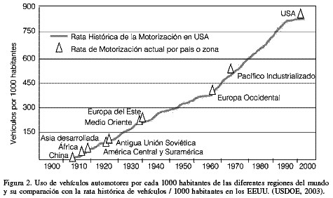Al considerar solo un aspecto del mejoramiento de la calidad de vida como lo es la motorización por habitante, puede calcularse el efecto que tendría, sobre el consumo de petróleo, llevar a China y otros países de Asia a la cantidad de vehículos por habitante que tenía EEUU en 1970 (450 vehículos por 1000 habitantes), tal como se muestra en la Figura 2. Esto aumentaría el consumo de petróleo en 57,9MMBBLD, suponiendo un consumo equivalente al de EEUU para el 2003 en el sector transporte (13MMBBLD; USDOE, 2003). Esto representa un incremento del 69% en el consumo de petróleo para el 2005 (84MMBBLD). Ahora bien, se podría considerar realizar este cambio de forma progresiva y suponer que se realiza en un plazo de 20 años. Esto representa un aumento interanual de 2,89MMBBLD, 1,5 veces mayor al observado en el periodo 2002-2006.