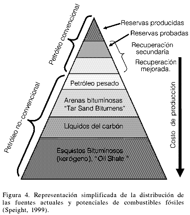 Las reservas mundiales están dominadas por crudos pesados y extrapesados. Se ha señalado que la Faja Petrolífera del Orinoco (FPO) tiene reservas recuperables de crudos pesados y extrapesados de 270MMMBLS (Bauquis, 1998; World Energy Council, 2001). Una magnitud similar adicional se estima está contenida en las arenas bituminosas de Canadá (Wightman, 2003). Speight (1999) comparó las posibilidades de obtención convencional de los combustibles fósiles con la punta de un iceberg. El crudo convencional solo representa una pequeña fracción de las fuentes fósiles de las cuales potencialmente se pueden derivar combustibles (Figura 4). La gran masa de fuentes fósiles de combustibles, particularmente los esquitos bituminosos (oil shale) y líquidos del carbón, aún no totalmente explotados, ofrece reservas que eventualmente podrían prolongar la era del petróleo. Sin embargo el uso de estas fuentes exigirá inversiones en tecnología y en costos de explotación.