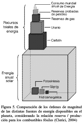 En la Figura 5 se ofrece una representación de la relación aproximada de magnitud de las distintas fuentes de energía disponibles en el planeta. Es claro lo limitado de las fuentes de combustibles fósiles (petróleo, gas y carbón). Así mismo se resalta lo ilimitado de la energía solar. Se podría hacer un inventario de la disponibilidad de energía fósil con base en la relación reserva / producción. De esta forma se dispondría de 40, 60 y 200 años de petróleo, gas natural y carbón, respectivamente (Clerici, 2004).