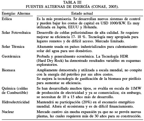 Cualquier posible escenario en el largo plazo pasa por un análisis de las fuentes alternas de energía. En la Tabla III se resumen las principales alternativas, donde resaltan la energía eólica y las fuentes químicas.