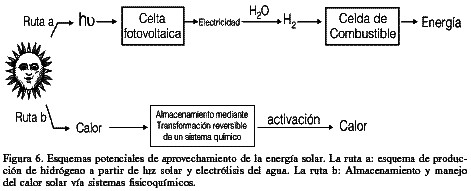 Por otro lado, la vieja costumbre sedentaria de guardar en verano lo que será escaso y necesario en invierno se debe aplicar a la energía también. Así, sistemas basados en transformaciones fisicoquímicas reversibles que permitan guardar el calor y, por supuesto, no contaminantes, podrán ofrecer vías de acumulación y manejo de energía solar. El esquema representado en la ruta b de la Figura 6 resume este concepto.